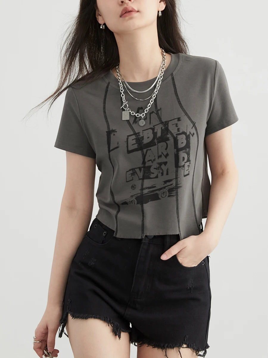 Elsy Slim Irregular Segmentation Letter Printed Short Sleeved T-Shirt